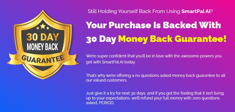 This Smart App Replaces Designers, Copywriters, Video Editors & More. Never Seen Before AI App That Creates Stunning Website In Any Niche With A Single Keyword In Just 60 Seconds FLAT! Save $6, 250 Bare Minimum Monthly By Saying Goodbye To ClickFunnels, Lead Pages, Jasper AI, Convertri, Wix, Shutterstock, Canva & 100 Complicated & Expensive Platforms…Still Holding Yourself Back From Using SmartPal AI? Your Purchase Is Backed With 30 Day Money Back Guarantee! We’re super confident that you’ll be in love with the awesome powers you get with SmartPal AI today. That’s why we’re offering a no questions asked money back guarantee to all our valued customers. Just give it a try for next 30 days, and if you get the feeling that it isn’t living up to your expectations, we’ll refund your full money with zero questions asked, PERIOD.