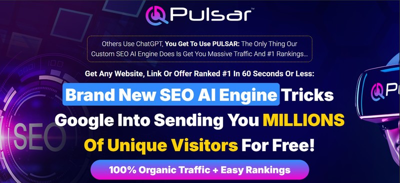 Others Use ChatGPT, You Get To Use PULSAR: The Only Thing Our Custom SEO AI Engine Does Is Get You Massive Traffic And #1 Rankings…Get Any Website, Link Or Offer Ranked #1 In 60 Seconds Or Less: Brand New SEO AI Engine Tricks Google Into Sending You MILLIONS Of Unique Visitors For Free! 100% Organic Traffic + Easy Rankings. Just Feed Your Link Inside PULSAR! If you are a beginner or a seasoned marketer and if you commit and follow this software then you will start to enjoy the luxury of automated, FREE traffic, #1 rankings and easy sales. Get PULSAR now and enjoy it for 30 Days. Listen, we know there are a lot of crappy software tools out there that will get you nowhere. Most of the software is overpriced and an absolute waste of money. So if you're a bit skeptical, that's perfectly fine. I'm so sure you'll see the potential of this groundbreaking software that I'll let you try it out 100% risk-free. Get PULSAR now and enjoy it for 30 Days. If you experience any tech problems and we're unable to fix it, you'll be eligible for a full refund - no tricks, no hassles. Don't Procrastinate - Take Action NOW! Get your copy of Pulsar! By now you should be really excited about all the wonderful benefits of such an amazing piece of software. You don't want to miss out on the wonderful opportunity presented today...And then regret later when it costs more than double...or it's even completely off the market! Guaranteed Or Your Money Back - 100% Risk Free And sure, saving 40% on the early bird is big news on its own…BUT what makes this “the deal of the year” is that it’s the first-ever software of its kind to do “AI” SEO optimization. THINK where you’d be if you were the first to start on Google in 2004.
