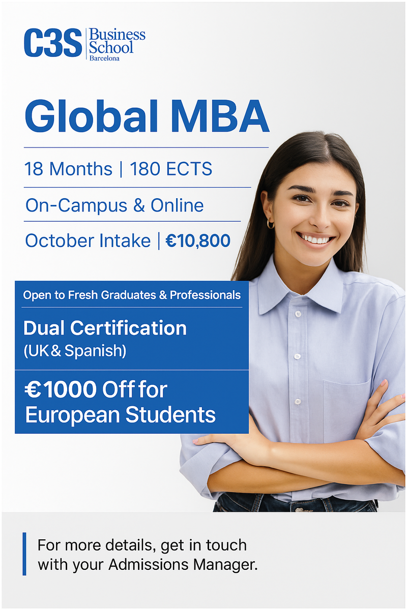 Among the institutions offering a Global MBA in Barcelona, C3S Business School stands out for its forward-thinking approach and commitment to academic excellence.